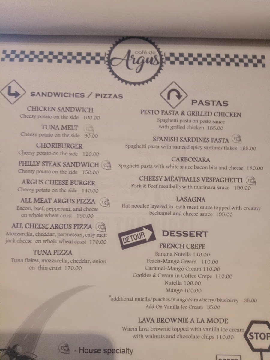 The menu at Cafe de Argus is both intriguing and diverse, showcasing a fusion of flavors that cater to various palates. For those keen on comfort food, indulge in the Spanish Sardines Pasta (₱240), where the rich, Mediterranean spices meld beautifully with the sardines, creating a delightful symphony of taste that dances on your palate. If you have a penchant for sweeter offerings, don't pass up the chance to savor their Caramel Mango Cream Crepe (₱185) — a dessert that wraps the vibrant flavors of mango in a smooth caramel embrace, perfect for satisfying your sweet tooth.